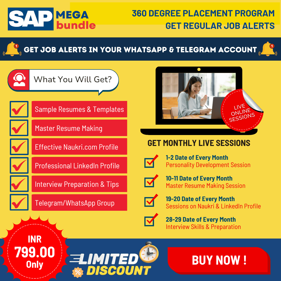 Get 360° Career Support – Online live session’s on Master Resume Making, Interview Preparation, Naukri & LinkedIn Profile Creation along with Frequent SAP Job Alerts via our Premium WhatsApp Group.